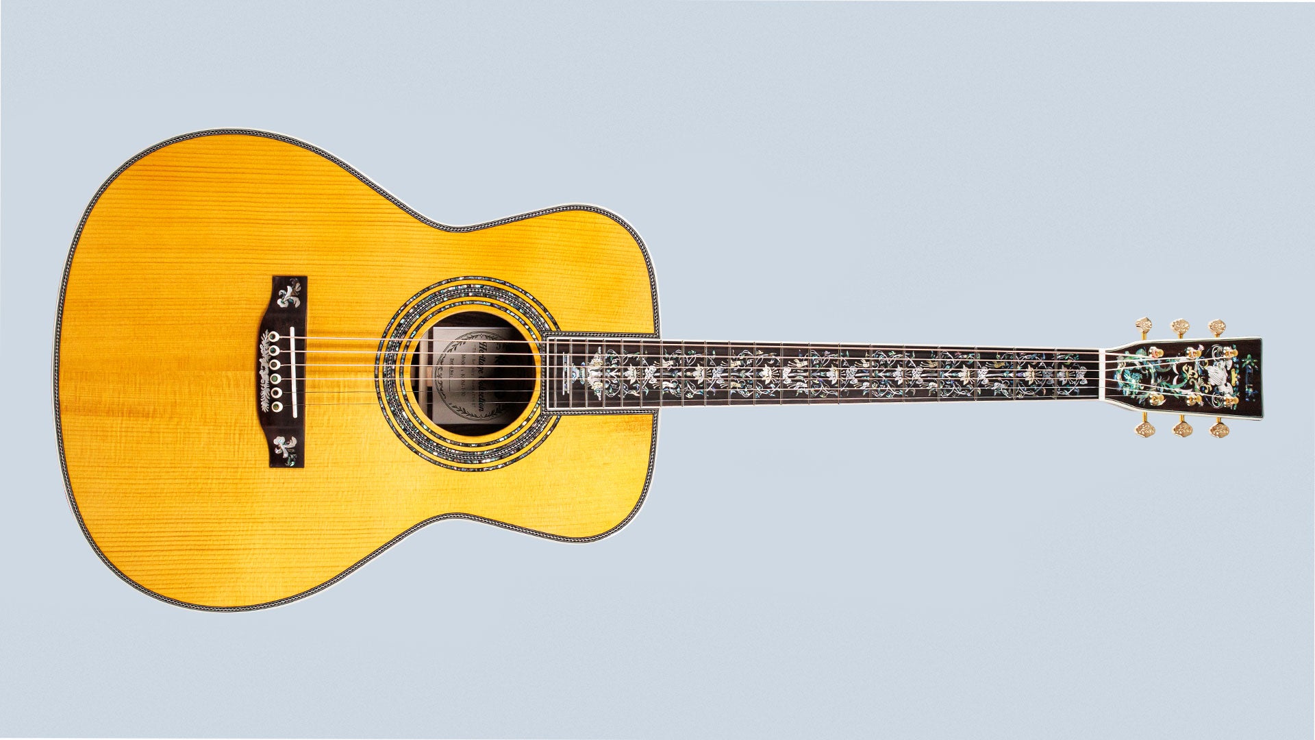 The guitar boasts a luxurious, beautiful, and distinct appearance with genuine Abalone inlay around the body. This is not a simple sticker overlay; it's a meticulously carved and inlaid work of art. The design draws from the Art Nouveau style, using elegant, flowing lines and botanical patterns to tell a story across the entire instrument. These intricate patterns can be found on the back, headstock, and fingerboard, all connected to create a cohesive and beautiful narrative.
