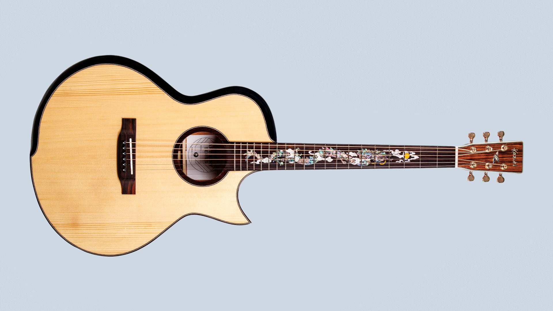 "The Grand Auditorium Cutaway body features a Full Bevel Armrest for superior playing comfort and extended sessions. Elegant Abalone/Pearloid inlays decorate the fingerboard. The robust 5-piece Mahogany and Rosewood neck ensures enhanced stability and tonal balance."